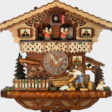 Uno spaccalegna al lavoro si vede su questo autentico orologio a cucù della Foresta Nera con tetto tipo chalet a scandole. Il cane da guardia, seduto tra abeti e tettoia per la legna osserva attentamente come lo spaccalegna fa il suo lavoro. Gli elementi di legno chiaro e scuro fanno un ottimo contrasto. La facciata della casa è decorata con una base a muro stilizzata di legno, finestre con traversini e imposte rosse con cuoricini, vasi di fiori, balconi lavorati in filigrana e un timpano decorativo. ll cuculo di legno canta una volta ogni mezz'ora e sempre allo scoccare dell'ora.(p.es. alle ore 15 3 volte). Dopo il canto esegue una delle due melodie. Nel frattempo, lo spaccalegna fa la legna, la ruota idraulica si muove e le coppie in costume tradizionale volteggiano ballando sul balcone. ll cuculo di legno canta una volta ogni mezz'ora e sempre allo scoccare dell'ora.(p.es. alle ore 15 3 volte). L'orologio ha a disposizione un blocco per la notte. Quadrante, cifre e lancette sono di legno. Il meccanismo a 24 ore deve essere caricato una volta al giorno. Sarà consegnato nella confezione originale con le istruzioni per l`uso. Questo modello é fabbricato dalla ditta Hönes di Titisee, che è insita nella tradizione del' orologeria vecchia di secoli.