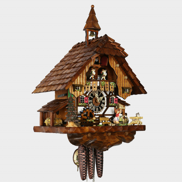 "Kissing Couple" is depicted on this original Black Forest Cuckoo Clock with shingled hip roof. The half-timbered framework makes for a friendly contrast to the walnut-stained solid-wood case. The Black Forest house is richly decorated with miniature windows with shutters, a balcony and a bell tower. The housefront is full of beautiful details, such as a wood shed with wood and straw, a water wheel, a wooden bench and a wagen, which makes a good perch for the cat. The solid-wood cuckoo calls the number of the hour on every full hour (e.g. 3:00 p.m. or 3:00 a.m. 3 times) and once on the half-hour.  After the cuckoo calls on both the hour and half-hour, one of the two alternating melodies plays. During the music, the couple kiss each other, while the water wheel moves to the music and the children dance on the balcony. The clockface and clockhands are all made of wood. This clock has a manual night switch off. The mechanical clockwork runs for 24 hours. This Black Forest Cuckoo Clock is delivered in an original carton with instructions. This romantic clock  is crafted by the Hönes company in Titisee, a family business deeply rooted in the century-old tradition of the clockmaking industry, and is well known for its high-quality Black Forest craftmanship.