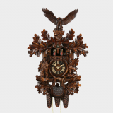 Der Adler als Symbol für Macht und Sieg breitet stolz seine Schwingen über dieser original Schwarzwälder Kuckucksuhr aus. Links und rechts warten gelassen der Jäger mit seinem Hund und der Gamsbock auf dem Felsvorsprung auf des weitere Geschehen. Das Holzgehäuse ist nussbaum gebeizt und reich mit tief geschnitztem Eichenlaub verziert. Der aus Holz gefertigte Kuckuck ruft zur vollen Stunde die Stundenanzahl (z.B. um 15.00 Uhr 3 Mal) und zur halben Stunde ein Mal. Nach dem Kuckucksruf ertönt stündlich eine der beiden Melodien. Zur Musik tanzen die in Schwarzwälder Tracht gekleideten Paare auf dem Balkon. Dieses Modell verfügt über eine manuelle Nachtabschaltung. Zifferblatt, Ziffern und Zeiger bestehen ebenfalls aus Holz. Das mechanische Rechenschlagwerk läuft eine Woche. Hergestellt wird dieses Motiv von der Firma Hönes in Titisee, die tief verwurzelt in die jahrhundertalte Tradition der Uhrmacherei ist und für Schwarzwälder Wertarbeit steht.