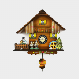 "Bayrische Musikanten" heißt diese Mini Kuckucksuhr im Schwarzwaldstil mit geschnitztem Walmdach. Vor dem Haus spielen zwei Musikanten und seitlich dreht sich ein Musikant mit seinem Bernhardiner auf einem Drehteller.  Das Holzgehäuse ist bemalt mit bunten Blumenwiesen und dekoriert mit einem Balkon,  Sprossenfenster mit Fensterladen und Blumenkästen und einer Tanne mit einem Wasserrad. Zur vollen Stunde ertönt ein Zwitschern, dann ein Kuckucksruf mit Echo. Wahlweise kann man den Kuckuckston auch auf Westminsterschlag umschalten. Eine manuelle Nachtabschaltung ist möglich. Das Quartzpendelwerk wird mit zwei 1,5V AA Batterien, die mitgeliefert werden (außer USA). Die Uhr wird im Originalkarton mit Gebrauchsanweisung ausgeliefert. Dieses Modell wird von der Firma Engstler hergestellt, ein seit Generationen geführtes Familienunternehmen, welches für Tradition und Technik steht.