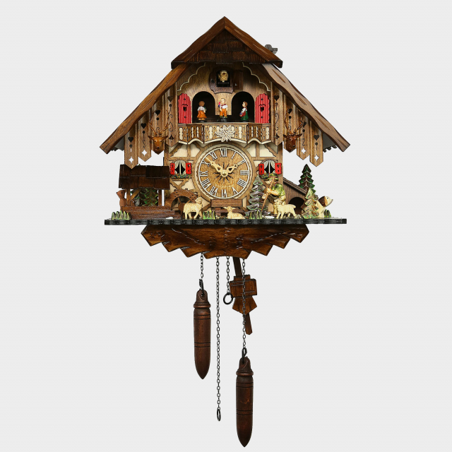Questo orologio a cucù della Foresta Nera con tetto a quattro spioventi a scandole raffigura un pastore con il suo gregge. Nel frattempo, che il pastore passa davanti alla casa, il cane sta attento che nessuna pecora si perda. Un capriolo si nasconde dietro gli abeti. L'alloggiamento di legno è abbellito con struttura a graticcio a vista, due teste di cervo (di plastica), un balcone lavorato in filigrana, e finestre con imposte con cuoricini e vasi di fiori. Davanti alla casa si vedono abeti, una ruota idraulica e una panchina. A lato c'è una catasta di legno e la cuccia del cane. Allo scoccare dell' ora il cuculo cinguetta e canta il numero di ore con eco. Dopo il canto esegue una delle 12 melodie. Nel frattempo, il pastore muove il suo bastone, la ruota idraulica si muove e i bimbi volteggiano ballando sul balcone. A lato si trova un interuttore, per spegnere o solamente la musica o insieme al cuculo. Tramite un sensore del buio il suono è automaticamente spento, ma l'orologio funziona ugualmente. L'orologeria a quarzo è azionata da tre pile 1,5V C che sono incluse. Sarà consegnato nella confezione originale con le istruzioni per l`uso. Questo modello é prodotto della ditta Engstler, un'azienda famigliare quale sta per tecnica e tradizione, gestita da generazioni dalla famiglia.