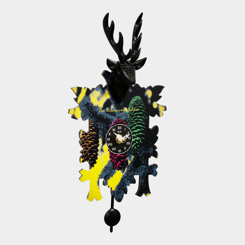 Tradition trifft Moderne. Diese Mini-Schilderuhren mit aktuellem Design sind Teil einer neuen Generation von Kuckucksuhren. Ein Holzschild mit den Umrissen einer klassischen Schnitzuhr ist 4-farbig mit einem Tannenzapfenmotiv bedruckt. Der Hirschkopf mit Geweihen ist aus Holz gefertigt. Zur vollen Stunde ertönt ein Zwitschern, dann ein Kuckucksruf mit Echo. Wahlweise kann man den Kuckuckston auch auf Melodie umschalten. Eine manuelle Nachtabschaltung ist möglich. Das Quarzwerk wird mit zwei 1,5V AA Batterien betrieben, die mitgeliefert werden. Die Uhr wird im Originalkarton mit Gebrauchsanweisung ausgeliefert. Dieses Modell wird von der Firma Trenkle hergestellt, ein seit Generationen geführtes Familienunternehmen, welches für Tradition und Technik steht.