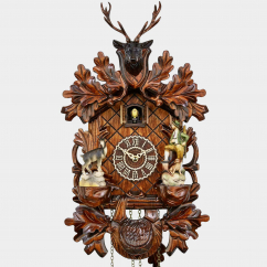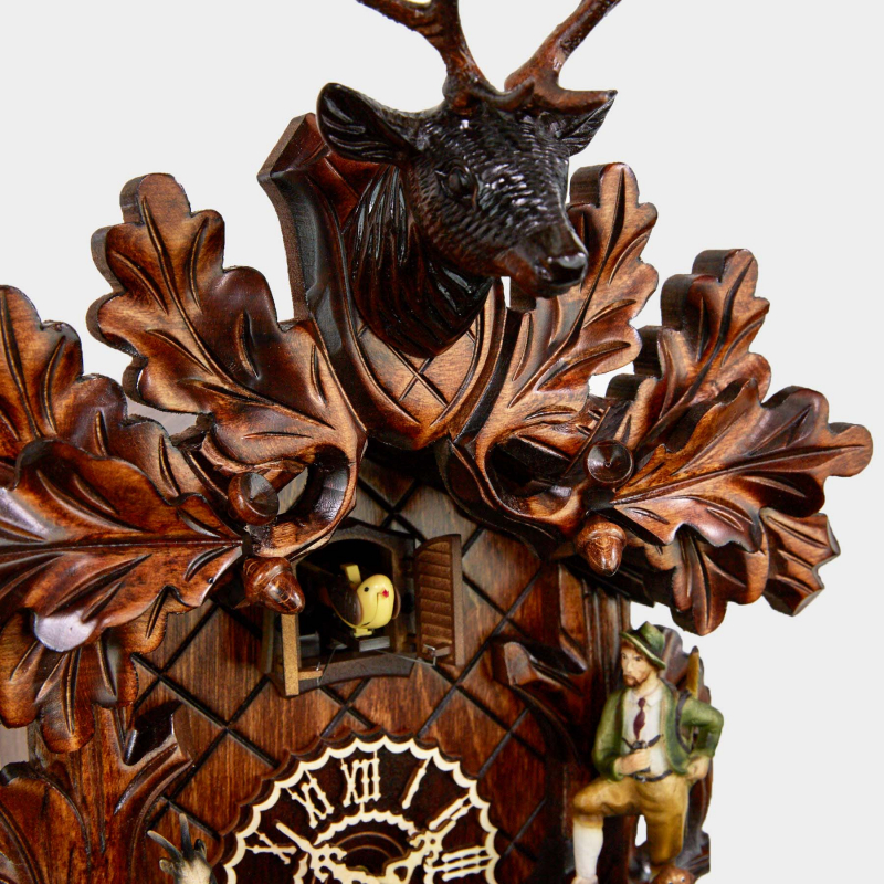 Mit dem Fernglas in der Hand und seinem Gewehr über der Schulter schaut der Jäger in die Weite und beobachtet das Wild im Walde. Über der Schwarzwälder Kuckucksuhr thront ein geschnitzter Hirschkopf mit stolzem Geweih. Das Holzgehäuse in Nussbaum gebeizt ist umrandet mit geschnitzten Eichenlaubblätter sowie einer Jagdtasche. Der Kuckuck öffnet zur vollen Stunde die Tür, zwitschert und ruft die Stundenanzahl mit einem Echo. Danach ertönt eine der 12 verschiedenen Melodien. An der Seite befindet sich ein Schalter um die Musik separat oder zusammen mit dem Kuckuck manuell abzustellen. Durch einen Lichtsensor ist bei Dunkelheit der Ton automatisch aus, die Uhrzeit jedoch läuft weiter. Das Zifferblatt und die Zeiger sind aus Holz. Diese Uhr wird von einem batteriegespeisten Quarzuhrwerk betrieben, das drei 1,5V Batterien Größe C benötigt (werden mitgeliefert). Die Kuckucksuhr wird im Originalkarton mit Gebrauchsanweisung ausgeliefert. Hergestellt wird diese Schwarzwälder Kuckucksuhr  von der Firma Trenkle, einem seit einem halben Jahrhundert bestehenden Familienunternehmen in Simonswald, dessen Markenzeichen es ist, bewährte Handarbeit mit neuester Technik zu vereinen.