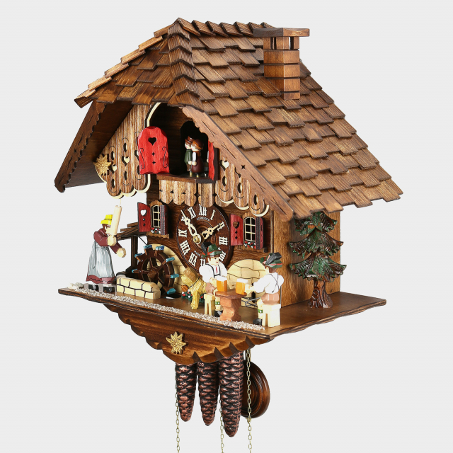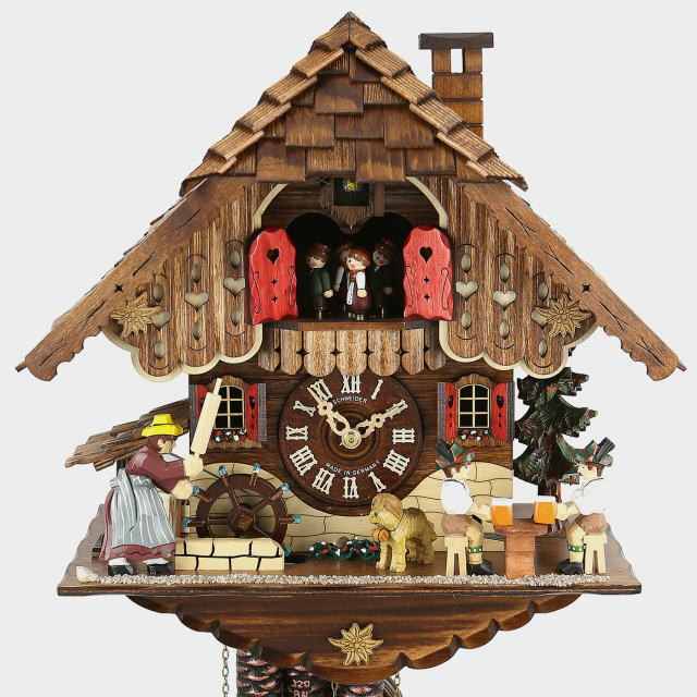 Qu'elle est cette "mégère" sur cette véritable pendule à coucou de la Forêt Noire avec une toiture en croupe recouverte de bardeaux et une cheminée ? Le coffer en bois est teinté en noyer et repose sur un soubassement clair. Sur la façade sont installées des fenêtres à croisillon avec des volets rouges et des jardinières fleuries. Autour de la maison, un chien monte la garde entre des sapins et des  massifs de fleurs. Le coucou en bois chante toutes les heures pleines le nombre d’heures (par ex. 3 fois pour 15 heures), et une fois toutes les demi-heures. Après le chant du coucou, l'une des deux mélodies retentit toutes les demi-heures. Sur la musique, une femme en colère brandit son rouleau à pâtisserie, parce-que les deux hommes boivent plutôt que de l'aider dans la maison. La roue à aube se met en mouvement et les danseurs en costume traditionnel bougent en rythme. Ce modèle est équipé d'un arrêt nocturne automatique ainsi que manuel. Le cadran, les chiffres et les aiguilles sont également en bois. La sonnerie à râteau mécanique fonctionne pendant 24 heures. Cette situation de la vie quotidienne est réalisée par la société Anton Schneider à Schonach. Cette société a débuté en 1848 dans une ferme et s'est établie aujourd'hui comme l'un des plus grands fabricants.