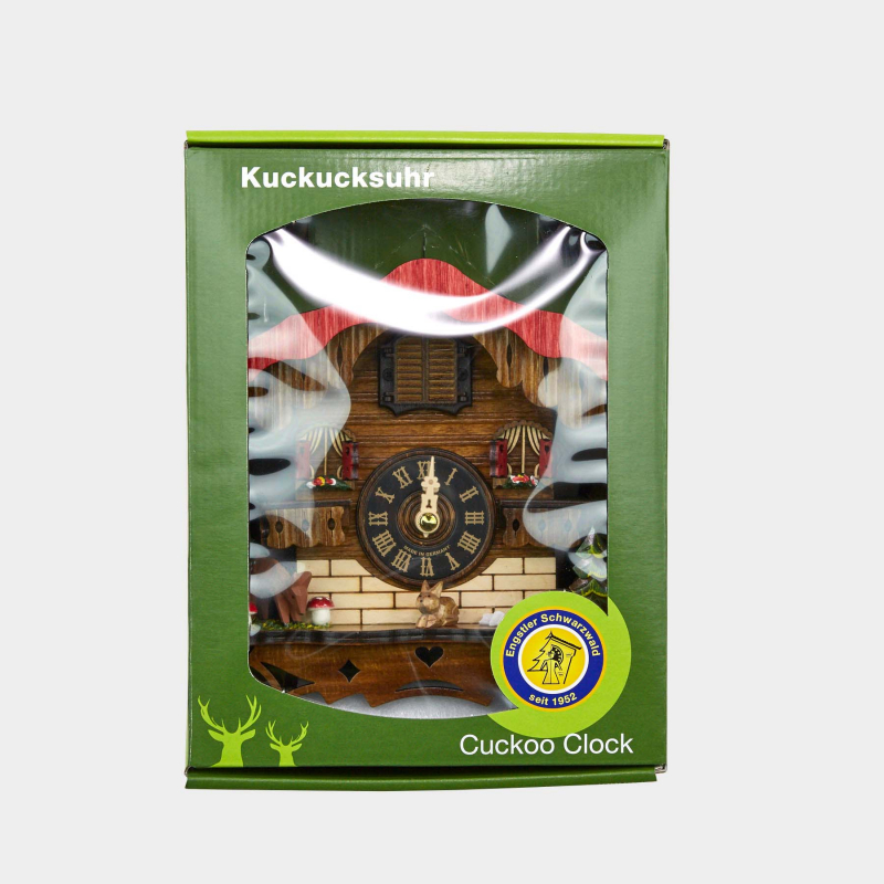 Ein hübsch gestaltenes Chalethäuschen - das ideale Geschenk. Die Waldtiere fühlen sich zwischen den Tannen sichtlich wohl und freuen sich über den Kuckucksruf. Das heimelige Chalethäuschen ist leibevoll gestaltet mit Sprossenfenster, seitlich angebrachte Balkone sowie einer aus Holz angdeutener Mauer. Der Kuckuck öffnet zur vollen Stunde die Tür, zwitschert und ruft die Stundenanzahl mit einem Echo. Danach ertönt eine der 12 verschiedenen Melodien.  An der Seite befindet sich ein Schalter um  den Kuckuck manuell abzustellen. Durch einen Lichtsensor ist bei Dunkelheit der Ton automatisch aus, die Uhrzeit jedoch läuft weiter. Diese Uhr wird mit einem Quarzwerk betrieben, das zwei 1,5V Batterien Größe C benötigt. Diese Kuckuckshr wird von der Firma Engstler hergestellt, ein seit Generationen geführtes Familienunternehmen, welches für Tradition und Technik steht.
