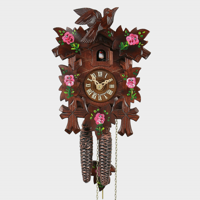 Ein Klassiker mit rosa Rosen ist diese Kuckucksuhr mit