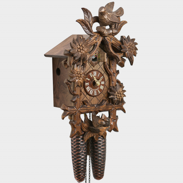 " Pura naturaleza " representa este original Reloj cuco. Descarado mira el cuco desde arriba al nido. Los dos pequeños, son sus polluelos, a los que ha entregado a unos padres forasteros para que los críe. La caja de madera esta enmarcada por talla de troncos sobre los que florecen las Edelweiss. El cuco elaborado en madera suena a las horas completas ( p.ej. a las 15 horas tres vece ) y a las medias una. Este reloj dispone de desconector manual de sonido. Esfera, cifras y manecillas son igualmente de madera. El mecanismo tiene autonomía para una semana. Lo elabora la Firma August Schwer en Schönwald, firma familiar fundada en 1.885.