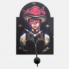 Diese moderne Pendeluhr hat die Umrisse einer traditionellen Schwarzwälder Schilderuhr und zeigt ein witziges Motiv: Die wollenen Pompons auf dem roten Bollenhut der Schwarzwälderin lösen sich in Wollfäden auf. Im Hut stecken Stricknadeln, so dass sie an eine "Strickliesl" erinnert. So nennt man im Schwarzwald die Strickhilfen in Puppenform, an denen die kleinen Mädchen ihre ersten Strickversuche machen.