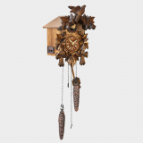 Cette pendule à coucou de la Forêt Noire avec un oiseau est un classique. Le coffer en bois est élégamment teinté en noyer, et entouré d'un cadre en feuilles d'érable sculptées. Le coucou ouvre la porte toutes les heures, gazouille et chante le nombre d’heures avec un écho. Ensuite retentit l'une des 12 mélodies. Un bouton sur le côté permet d'éteindre la musique séparément ou avec le coucou. Un capteur de lumière coupe automatiquement le son dans l'obscurité ; l'heure continue cependant à tourner. Cette horloge fonctionne avec un mouvement à quartz, qui nécessite trois piles 1,5 V type C. Ce motif traditionnel est réalisé par la société Engstler, une entreprise familiale depuis des générations, synonyme de tradition et de technicité.