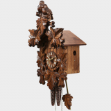 Turteltauben denkt man spontan bei diesem Spatzenpaar auf dieser nussbaumgebeizten und handgefertigten original Schwarzwälder Kuckucksuhr. Tief geschnitzte Ahornblätter zieren das Holzgehäuse, auf dem die beiden schnäbeln und balzen. Der Kuckuck, welcher aus Holz gefertigt ist, ruft zur vollen Stunde die Stundenanzahl (z.B. um 15.00 Uhr 3 Mal) und zur halben Stunde ein Mal. Diese Uhr verfügt über eine manuelle Schlagabschaltung. Zifferblatt, Ziffern und Zeiger bestehen ebenfalls aus Holz. Das mechanische Rechenschlagwerk läuft 24 Stunden. Dieses ideale Hochzeitsgeschenk  wird von der Firma Gerhard Schwer in Schonach hergestellt, die seit 1900 eine Holzschnitzerei und seit 1972 in der 4. Generation eine Kuckucksuhrenfabrikation ist.