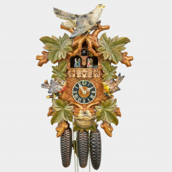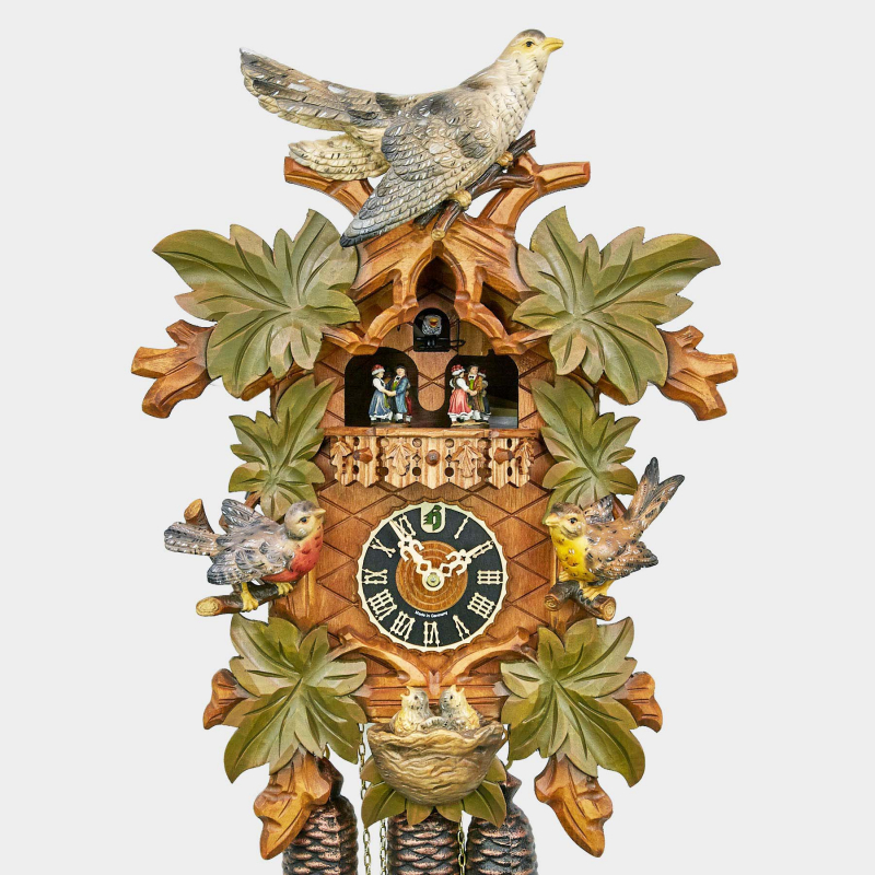 I genitori di uccelli attenti possono essere visti su questo originale orologio a cucù della Foresta Nera. Il cuculo che li sta sorvolando ha appena messo uno dei suoi piccoli nel loro nido? La cassa di legno è in noce tinto e dipinto a mano.  Le foglie d'acero circondano il nido con i giovani uccelli. Il cuculo di legno chiama il numero di ore all'ora (ad esempio alle 15.00 3 volte) e una volta a mezz'ora. Dopo il richiamo del cuculo, una delle due melodie suona ogni ora. Con la musica le coppie in costume tradizionale iniziano a ballare sul balcone. Questo modello è dotato di spegnimento notturno manuale e automatico (tra le 21.00 e le 8.00). Quadrante, numeri e lancette sono anch'essi in legno. Il meccanismo di percussione meccanica funziona per una settimana. Questo orologio a cucù viene consegnato nella scatola originale con le istruzioni e il certificato VDS. Questo orologio è prodotto dalla ditta Hönes di Titisee, profondamente radicata nella tradizione secolare dell'orologeria, e rappresenta l'artigianato della Foresta Nera.