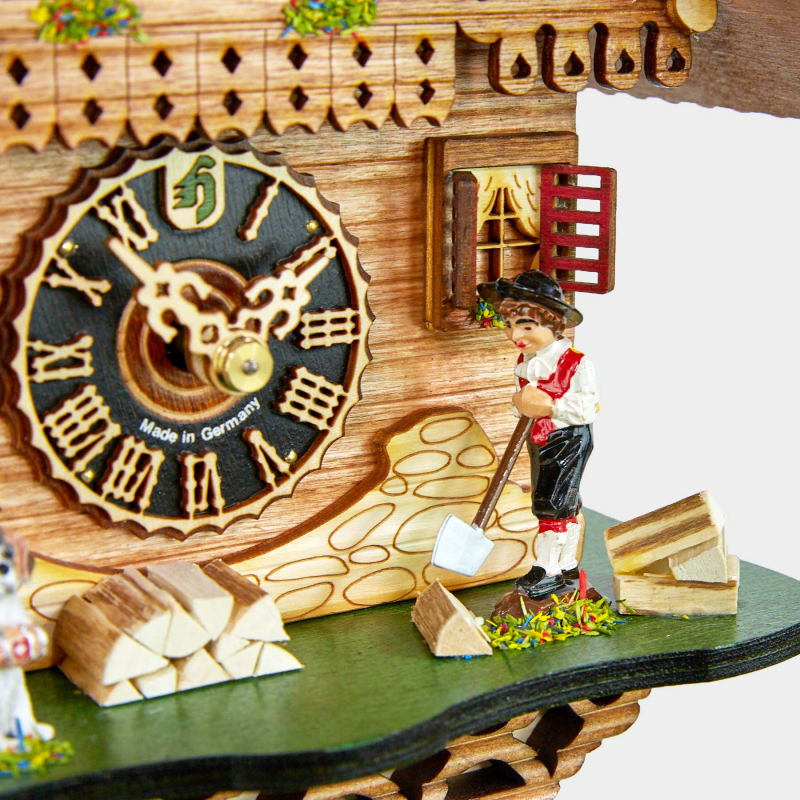 Auf einem Schwarzwälder Hof hat man immer zu tun, wie zum Beispiel das Holz hacken für den Wintervorrat. Diese original Schwarzwälder Kuckucksuhr präsentiert sich mit einem traditionellen geschindeltem Walmdach. Sprossenfenster geschmückt mit Blumen und  passende Herz-Fensterladen, ein Balkon und eine aus Holz angedeuteten Mauer dekorieren das in eichefarbene, gebeizte Holzgehäuse. Der aus Holz gefertigte und bemalte Kuckuck ruft zur vollen Stunde die Stundenanzahl (z.B. um 15.00 Uhr 3 Mal) und zur halben Stunde ein Mal. Dieses Modell verfügt über eine manuelle Nachtabschaltung. Zifferblatt, Ziffern und Zeiger bestehen ebenfalls aus Holz. Das mechanische Rechenschlagwerk läuft 24 Stunden. Diese  Kuckucksuhr wird im Originalkarton mit Gebrauchsanweisung und VDS-Zertifikat ausgeliefert. Hergestellt wird diese original Schwarzwälder Kuckucksuhr von der Firma Hönes in Titisee, die tief verwurzelt in die jahrhundertalte Tradition der Uhrmacherei ist und für Schwarzwälder Wertarbeit steht.