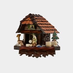 Dieses Seitenhaus ist die perfekte Ergänzung zu einer Kuckucksuhr im Hausdesign. Das Haus ist nach links geneigt, sodass es rechts von einer Kuckucksuhr hängen kann. Das Seitenhaus hat ein Walmdach mit Holzschindel. Ein hübsches Fenster mit grünen Fensterläden und Blumen schmückt die Hausfront. Im Haus ist eine Holzsäge zu sehen. Ein Arbeiter steht vor der Säge und bearbeitet Holz für den Winter. Links sprudelt der Brunnen und rechts ist das Wasserrad. Vor dem Wasserrad ist der Holzvorrat für den Winter gestapelt.