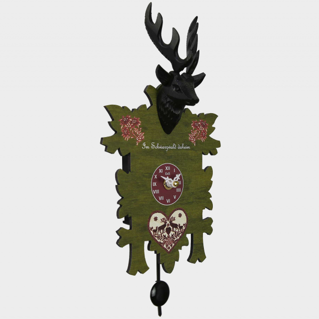 La tradizione incontra la modernità. Mini orologio a cucù con frontalino in legno stampato verde in design pezzo da caccia e accenti neri.  Le corna di cervo sono di legno. Come un fiore rosso di spicco si presentano fiori rossi e cervi in un cuore. All'ora intera si sente un cinguettio, poi un richiamo a cucù con l'eco. In alternativa, il suono del cuculo può essere commutato in melodia. È possibile un arresto notturno manuale. Il movimento al quarzo è alimentato da due batterie AA da 1,5V, che sono incluse. L'orologio viene consegnato nella confezione originale con le istruzioni per l'uso. Questo modello è prodotto da Trenkle, un'azienda a conduzione familiare che opera da generazioni ed è sinonimo di tradizione e tecnologia.