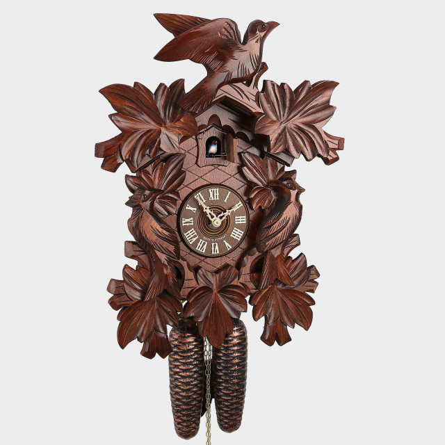 Ein klassischer Dreivogel ist diese original Schwarzwälder Kuckucksuhr. Das Holzgehäuse ist nussbaum-mahagonifarben gebeizt und mit Ahornblättern verziert. Links und rechts hämmern zwei Spechte. In der Mitte sitzt der Kuckuck zum Abflug bereit. Der aus Holz gefertigte Kuckuck ruft zur vollen Stunde die Stundenanzahl (z.B. um 15.00 Uhr 3 Mal) und zur halben Stunde ein Mal. Dieses Modell verfügt über eine manuelle Nachtabschaltung. Zifferblatt, Ziffern und Zeiger bestehen ebenfalls aus Holz. Das mechanische Rechenschlagwerk läuft eine Woche. Hergestellt wird dieser Klassiker von der Firma Hekas in Schonach, die bereits im Jahr 1938 von Helmut Kammerer gegründet wurde und in 3. Generation für "Tradition in Perfektion" steht.