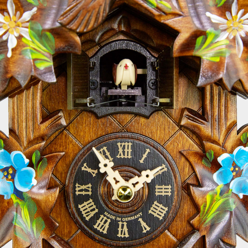 Ein Klassiker ist dieses Schwarzwälder Kuckucksuhr mit Vogelmotiv. Das Holzgehäuse ist schlicht nussbaum gebeizt und mit einem Rahmen aus geschnitztem Ahornlaub umgeben. Edelweiß und Enzian verzieren die Schnitzerei. Der Kuckuck öffnet zur vollen Stunde die Tür, zwitschert und ruft die Stundenanzahl mit einem Echo. Danach ertönt eine der 12 verschiedenen Melodien. An der Seite befindet sich ein Schalter um die Musik separat oder zusammen mit dem Kuckuck abzustellen. Durch einen Lichtsensor ist bei Dunkelheit der Ton automatisch aus, die Uhrzeit jedoch läuft weiter. Diese Uhr wird mit einem Quarzwerk betrieben, das drei 1,5V Batterien Größe C benötigt (werden mitgeliefert). Dieses traditionelle Motiv wird von der Firma Engstler hergestellt, ein seit Generationen geführtes Familienunternehmen, welches für Tradition und Technik steht.