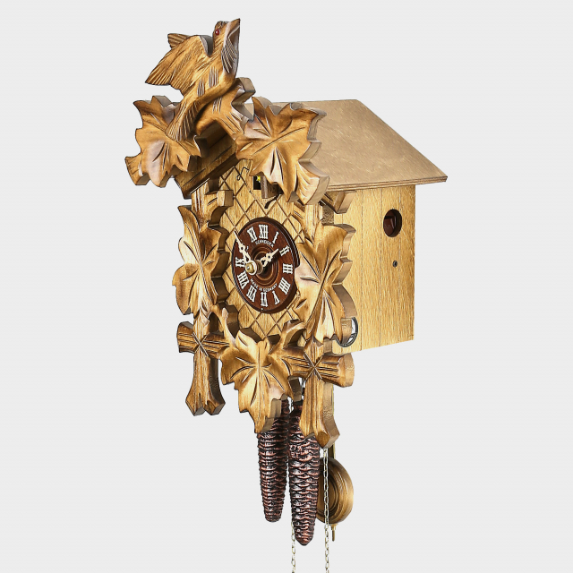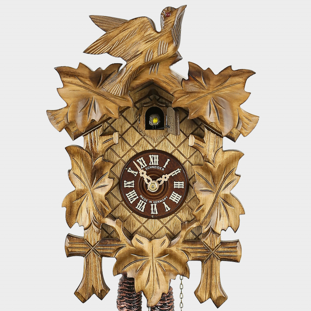 Dieses Vogelmotiv ist ein Klassiker unter den original Schwarzwälder Kuckucksuhren. Das Holzgehäuse ist eiche gebeizt und mit Ahornblättern verziert. In der Mitte sitzt der Kuckuck zum Abflug bereit. Der aus Holz gefertigte Kuckuck ruft zur vollen Stunde die Stundenanzahl (z.B. um 15.00 Uhr 3 Mal) und zur halben Stunde ein Mal. Dieses Modell verfügt über eine manuelle Nachtabschaltung. Zifferblatt und Zeiger bestehen ebenfalls aus Holz. Das mechanische Rechenschlagwerk läuft 24 Stunden. Hergestellt wird dieses Modell von der Firma Anton Schneider in Schonach, die 1848 in einem Bauernhaus beginnend sich bis heute zu einem der größten Hersteller etabliert hat.