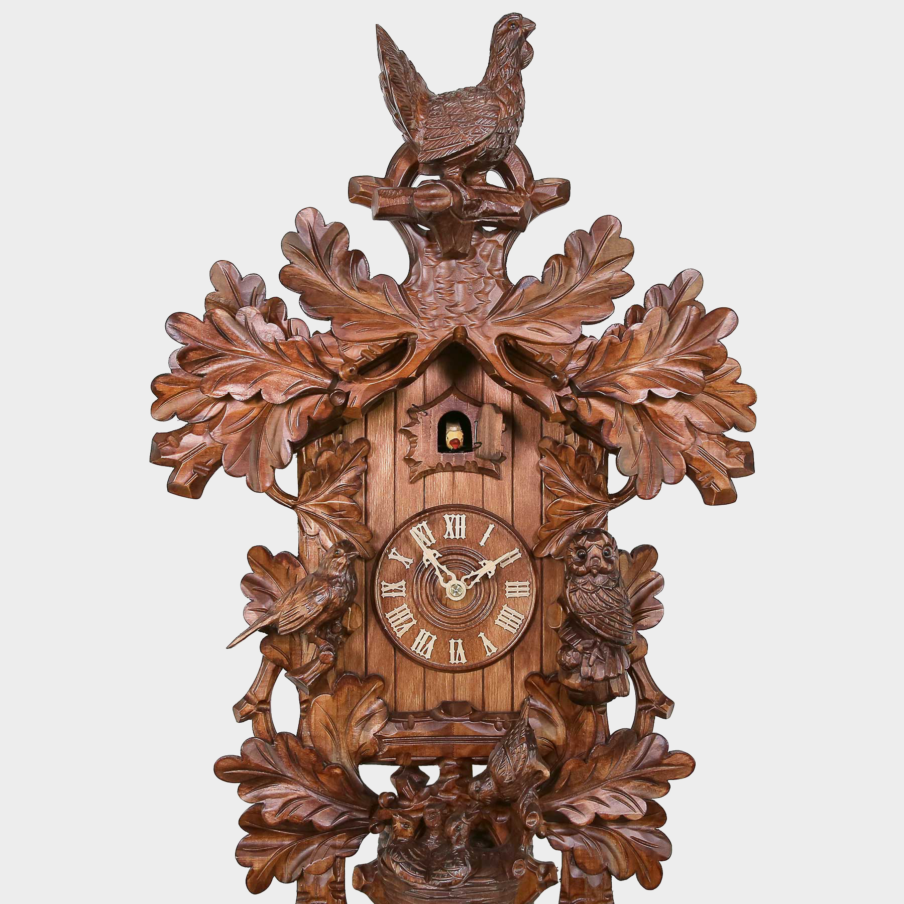Stolz wacht das Auerhuhn über diese original Schwarzwälder Kuckucksuhr. Ein Vogel und eine Eule mit Ihren Jungen fühlen sich zwischen den handgeschnitzten Eichlaubblätter sichtlich wohl. Der aus Holz gefertigte Kuckuck ruft zur vollen Stunde die Stundenanzahl (z.B. um 15.00 Uhr 3 Mal) und zur halben Stunde ein Mal. Diese Uhr verfügt über eine manuelle Schlagabschaltung. Zifferblatt und Ziffern und Zeiger bestehen ebenfalls aus Holz. Das mechanische Rechenschlagwerk läuft eine Woche. Die Uhr wird im Originalkarton mit Gebrauchsanweisung und VDS-Zertifikat ausgeliefert. Dieses besondere Schnitzerei wird von der Firma Gerhard Schwer in Schonach hergestellt, die seit 1900 eine Holzschnitzerei und seit 1972 in der 4. Generation eine Kuckucksuhrenfabrikation ist.