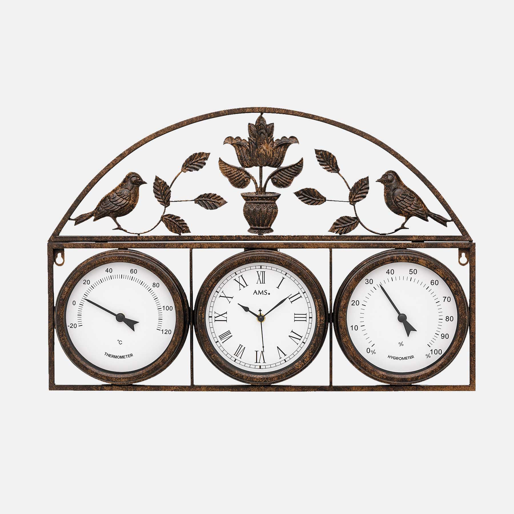 Diese moderne Wanduhr hat nicht nur ein Quarzwerk, sondern zusätzliche Zifferblätter, die die Temperatur und den Luftfeuchtigkeitsgehalt anzeigen. Das wettergeschützte Metallgehäuse wird durch zwei Vögel, Blätterranken und eine Blume ebenfalls aus Metall verziert und von einem Halbbogen umrahmt. Sowohl für drinnen als auch für draußen geeignet ist dieses dekorative Schmuckstück.